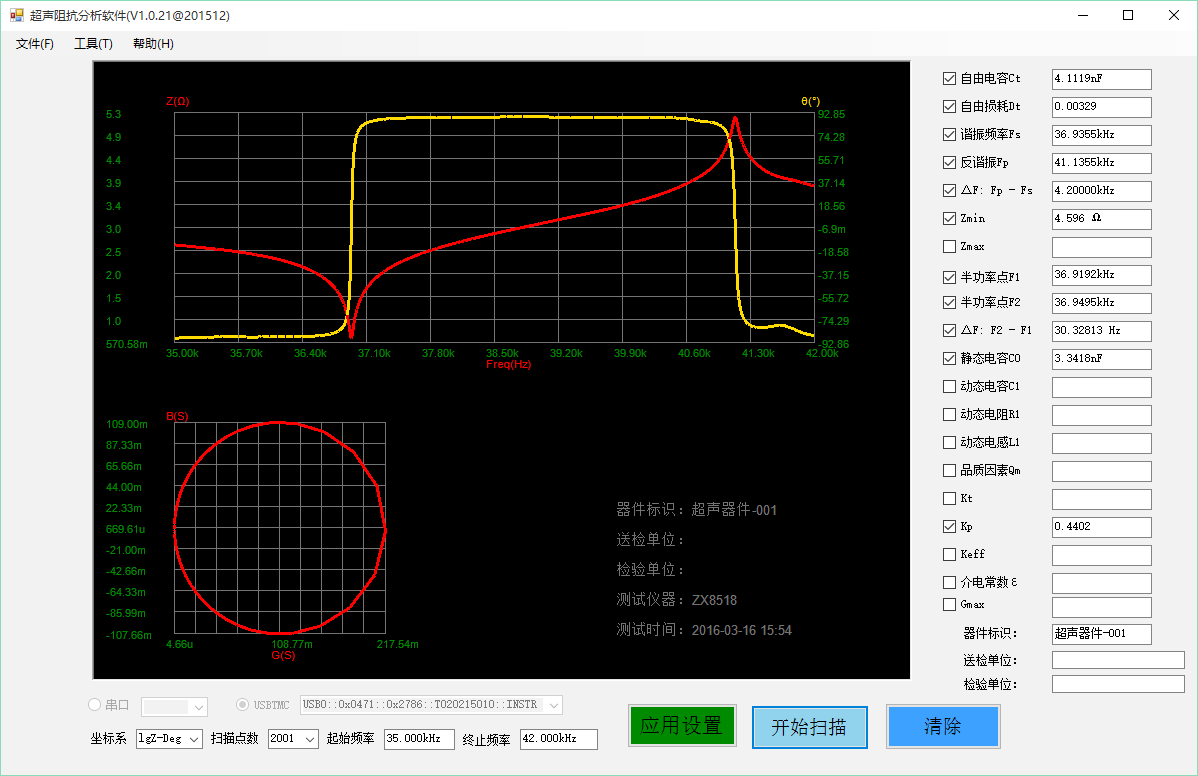 ZX70A/80A阻抗分析儀可以測(cè)量和評(píng)定壓電陶瓷片、壓電換能器、蜂鳴片等各種器件、設(shè)備的參數(shù)和性能優(yōu)劣。通過(guò)阻抗-相位-頻率曲線圖和導(dǎo)納圓進(jìn)行判斷,一目了然。